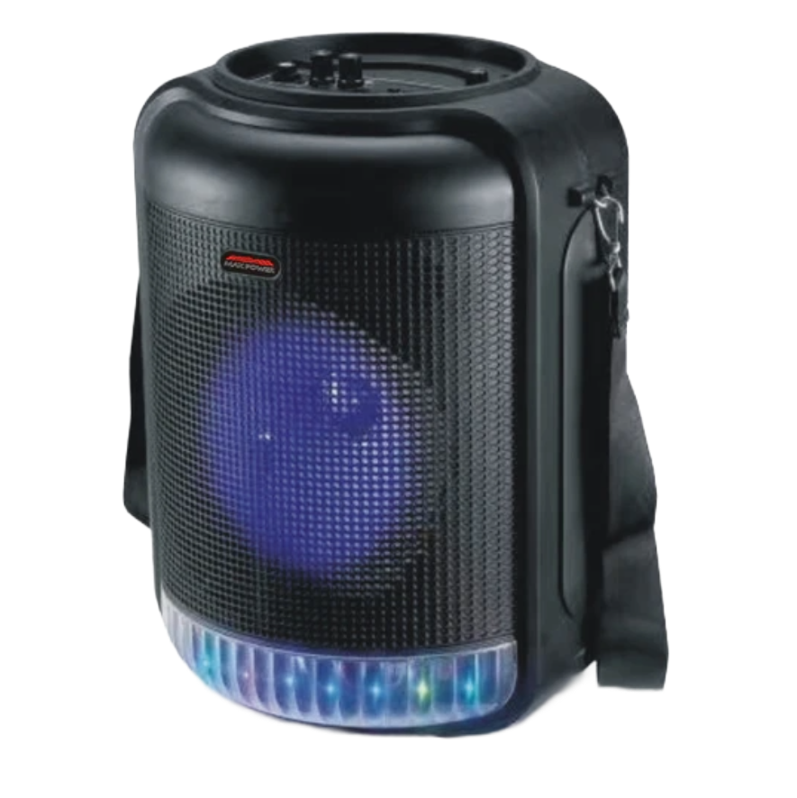 Altavoz portátil 8” con luz frontal, correa, mic con cable y control remoto. 15W, 95Hz–18KHz, S/N 71dB, batería 3.7V/1800mAh.