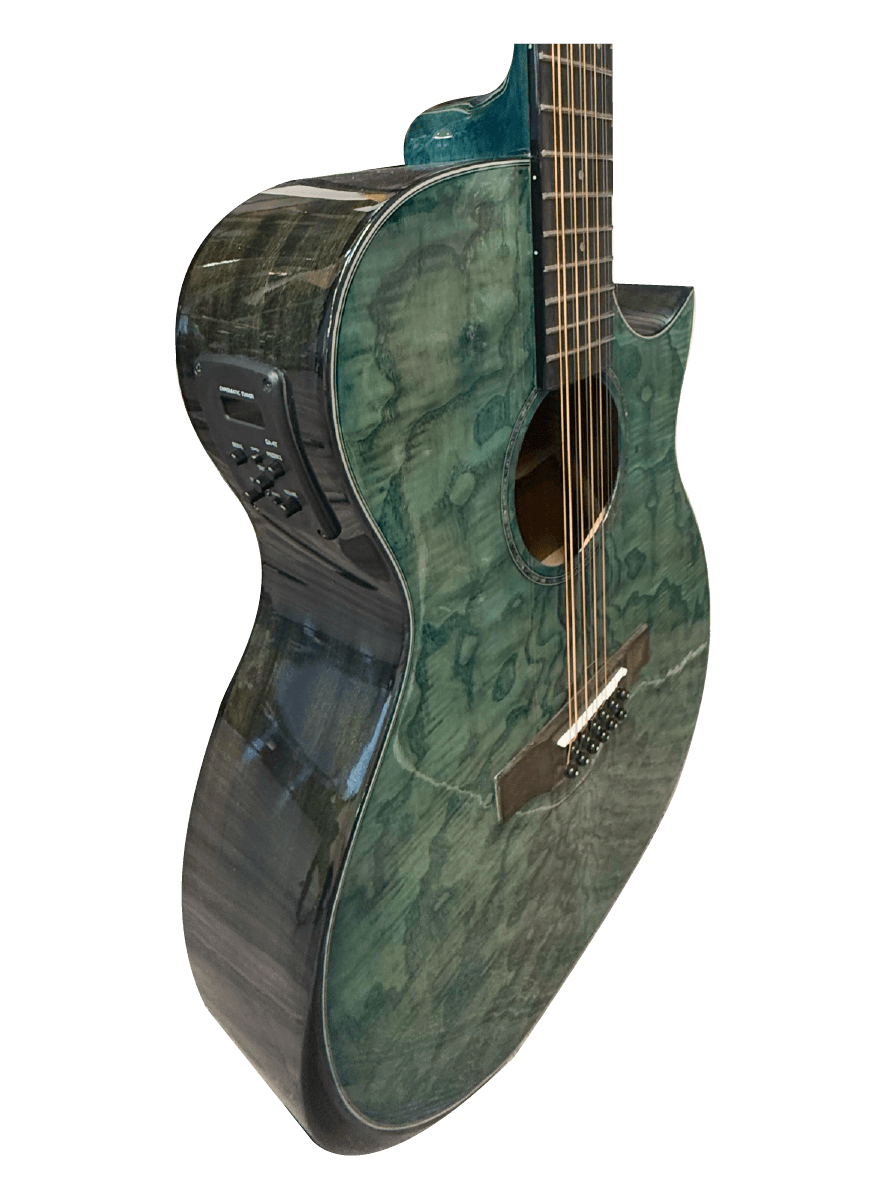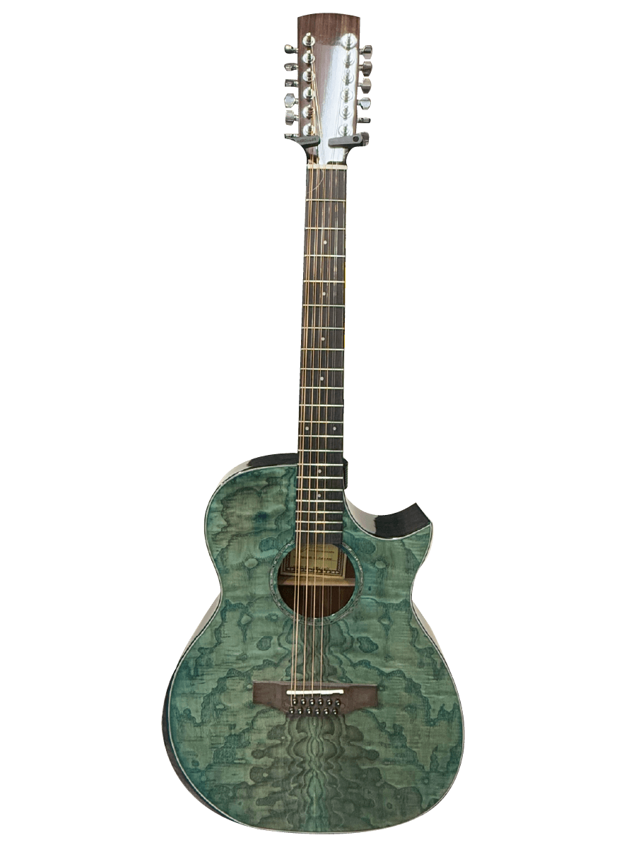 Don Cortez 12-string acoustic guitar with curly ash body and built-in electronics — available in blue or natural finishes.