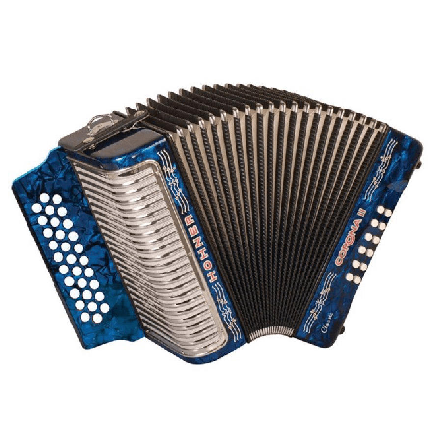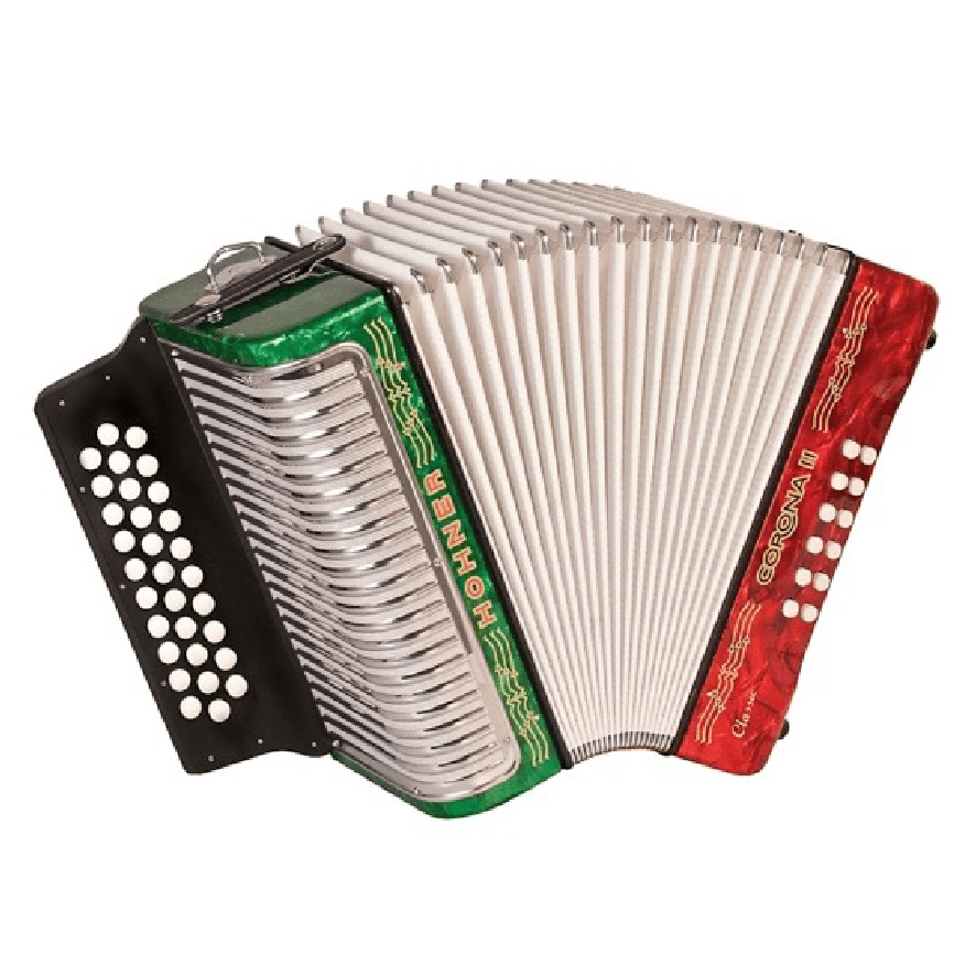 Hohner Corona II Classic — 3-row diatonic accordion with elegant wood construction and colored celluloid finish. Designed for professional Norteño, Tex-Mex, and Vallenato musicians.