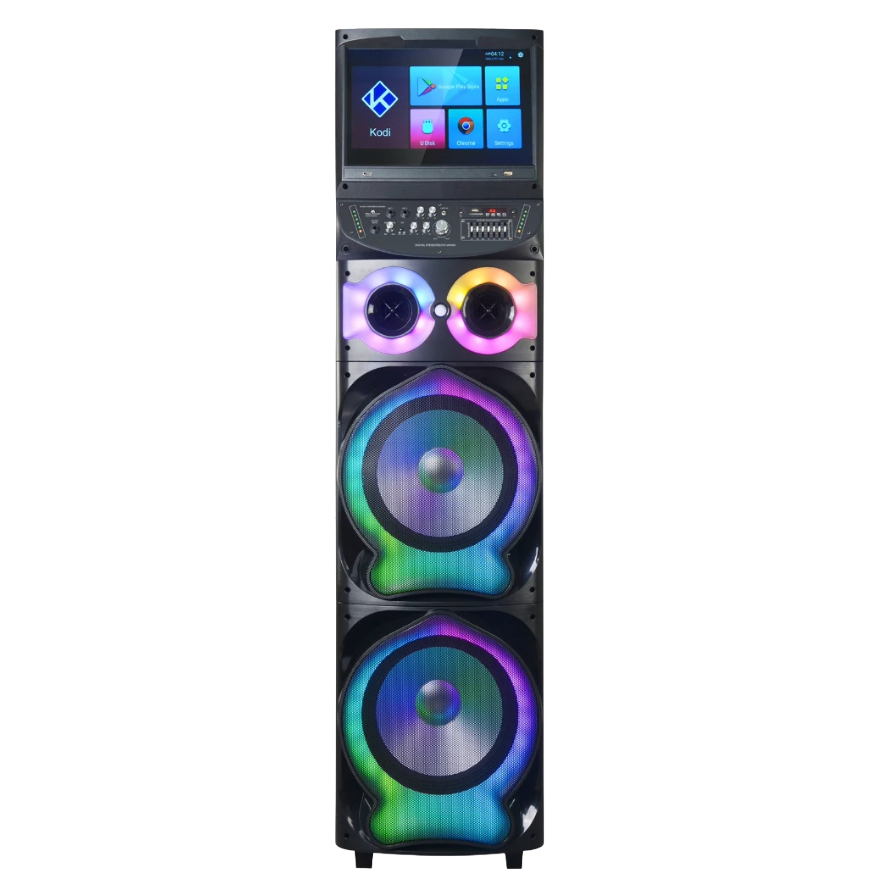 12” x 2 karaoke speaker con pantalla táctil 15” + Wi-Fi, Android 11, 32 GB, 2GB RAM, Bluetooth, FM/AM/RDS, Mirrorlink y trolley. Incluye mic y control remoto.