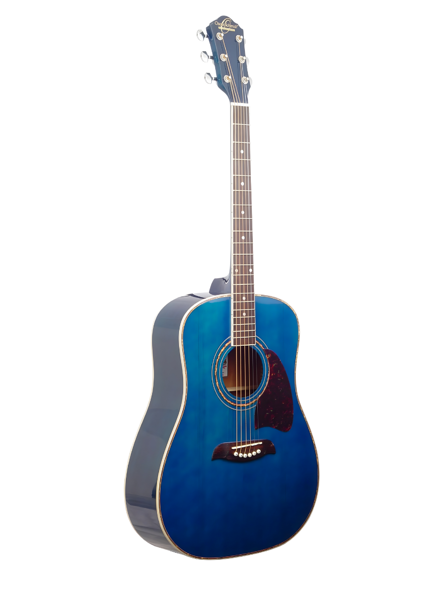 Oscar Schmidt OG2TBL-A — a Trans Blue dreadnought acoustic guitar offering rich tone, outstanding projection, and the premium craftsmanship Oscar Schmidt is known for. Ideal for students, singer/songwriters, and performers seeking style and reliability.