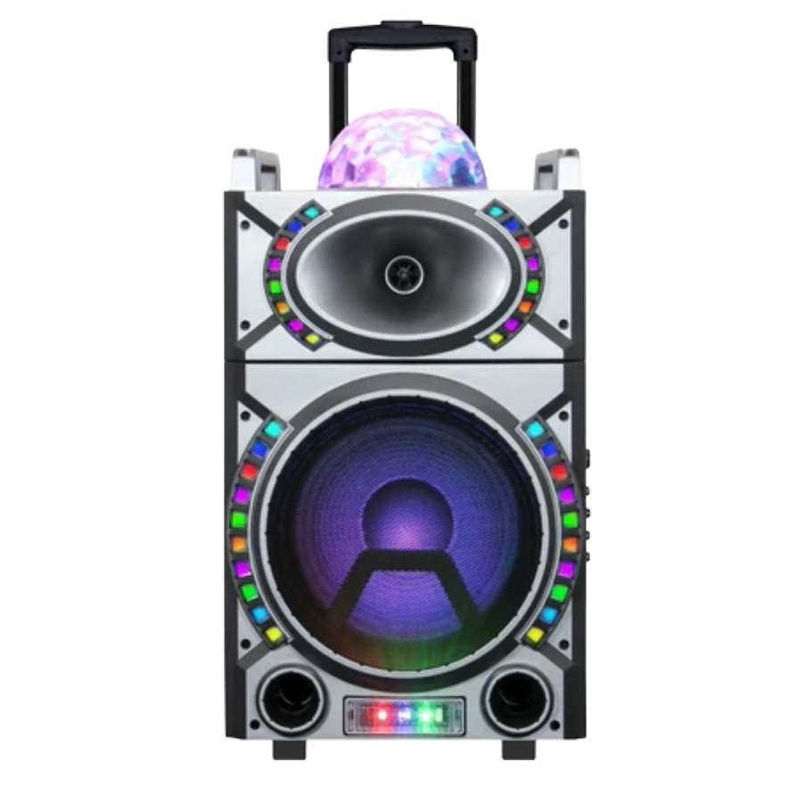 Parlante trolley 10” con tweeter 1”, USB/SD, Bluetooth, FM, 5000W máx, mic con cable y control remoto, LED y display. Varios colores.
